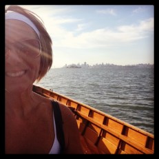 Ever since that first swim, the Bay has wedged itself deeply into my soul. I am no longer a spectator—I have grown into a full-fledged participant in all that our Bay has to offer. I swim a couple times a week and have inspired others to join me so that they, too, could experience the water’s cool embrace. I also glide across the currents of the Bay with my crew as we row vintage wooden boats while being chased by playful harbor seals. I cannot describe the joy I feel when their smooth, round heads and huge, black eyes pop up just next to my oar. Lines of pelicans soar by, and remind me how lucky I am to be out there. Just seeing the animals and natural beauty of the Bay makes my heart swell with love for this special place that is our home.